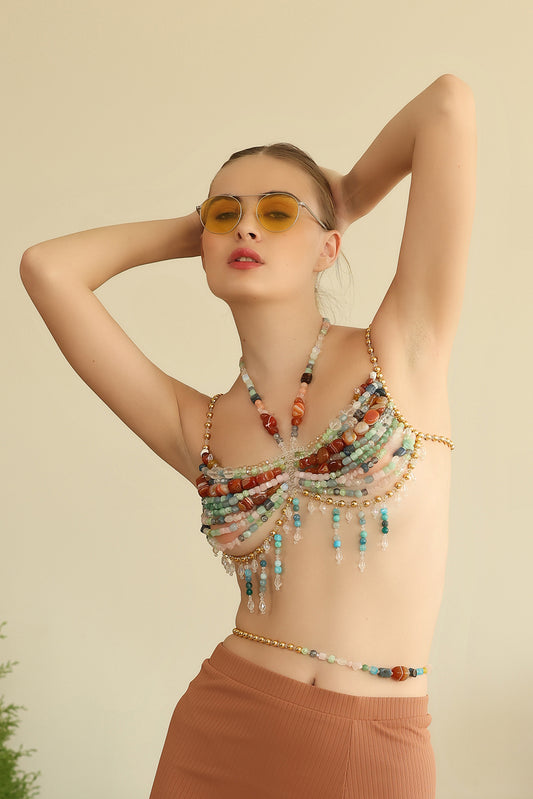 Handmade Beaded Gemstone Bralette with Draped Crystal Chains