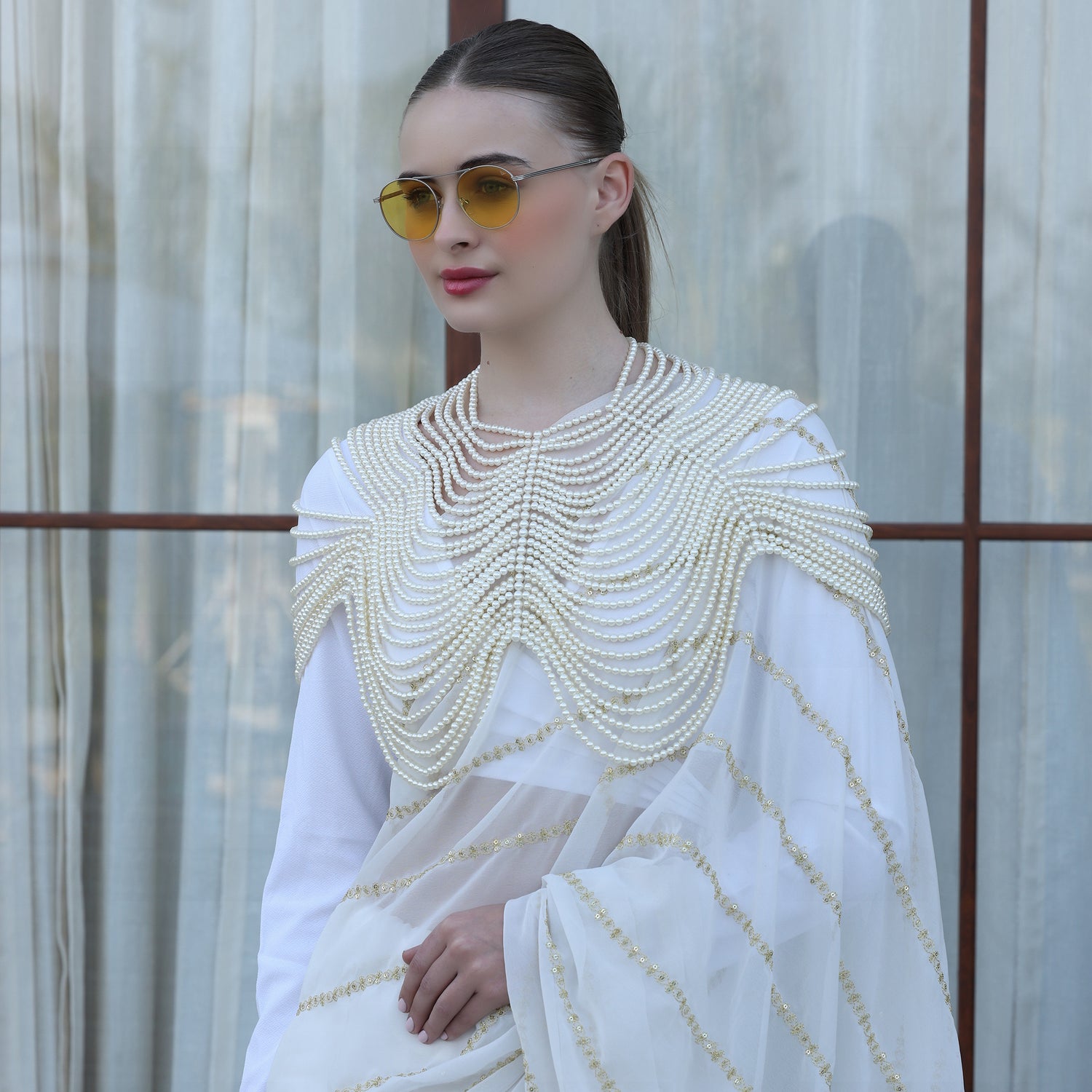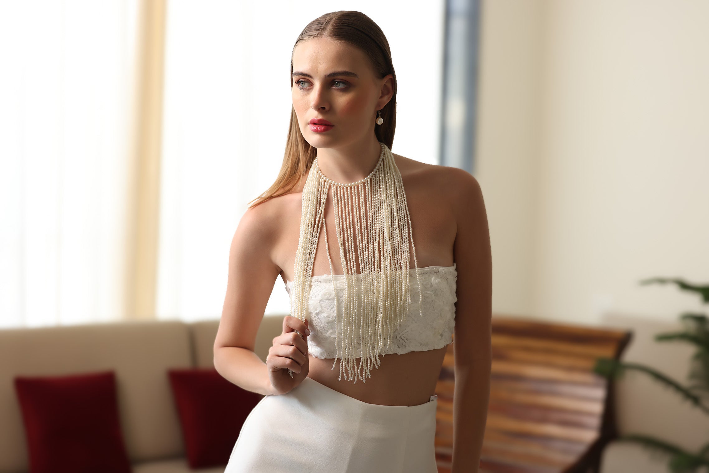 Pearl White Beaded Bra & Skirt Set Luxe Handmade Resortwear