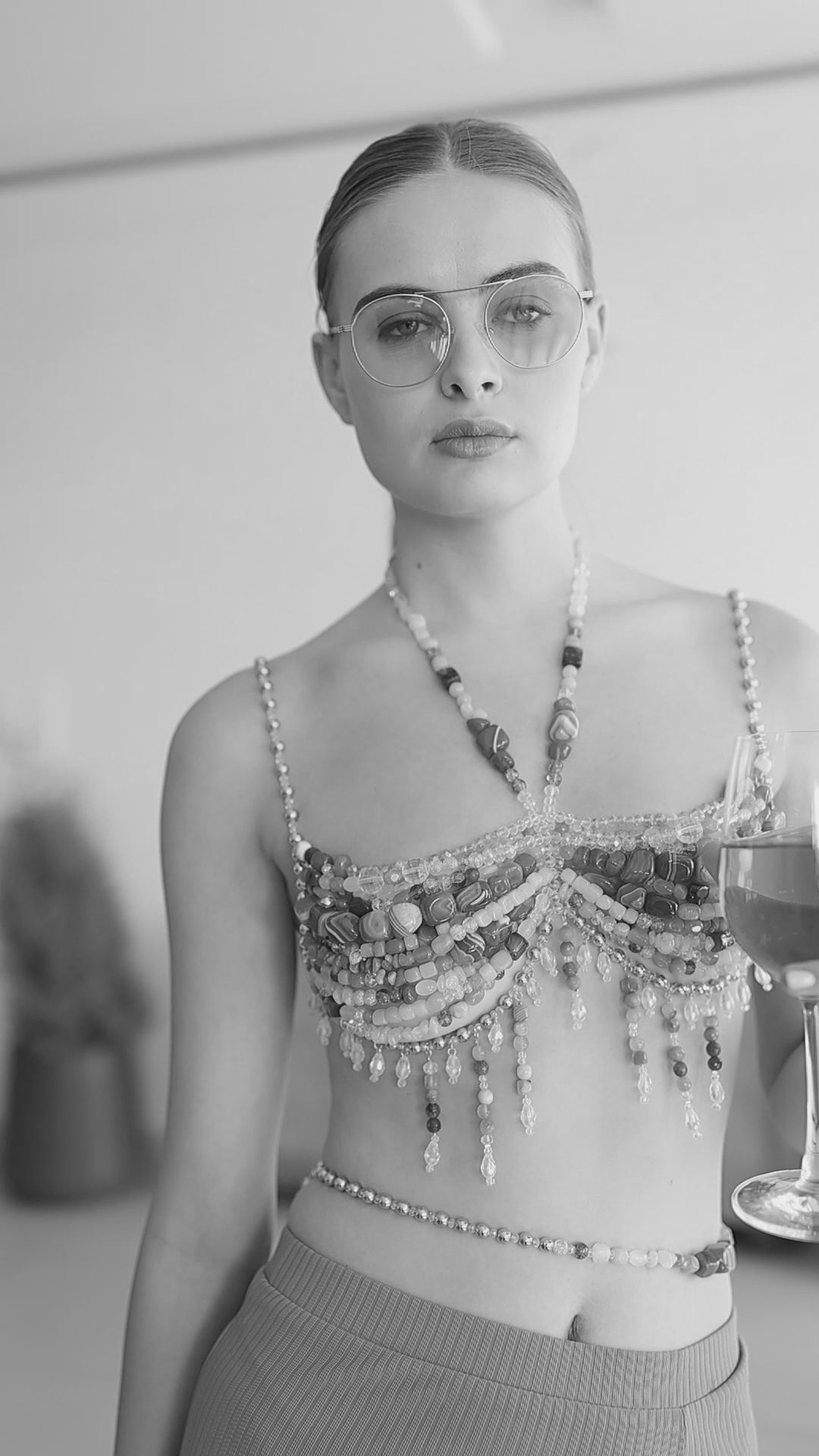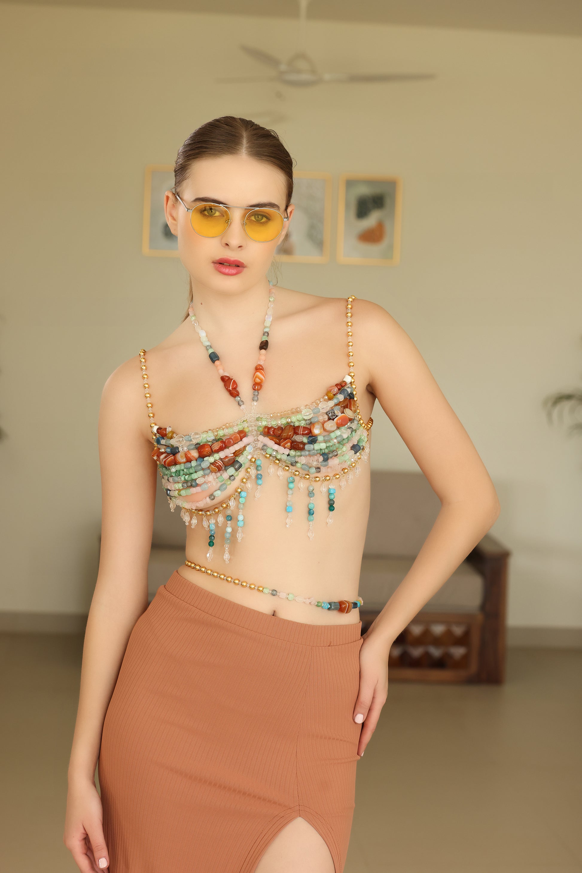 Make a bold statement with this handcrafted multicolor gemstone beaded bralette, featuring a mesmerizing mix of natural stones, crystal accents, and delicate gold bead details. Designed for the fashion-forward trendsetter, this luxurious body jewelry piece is perfect for festival wear, beach looks, and editorial styling.