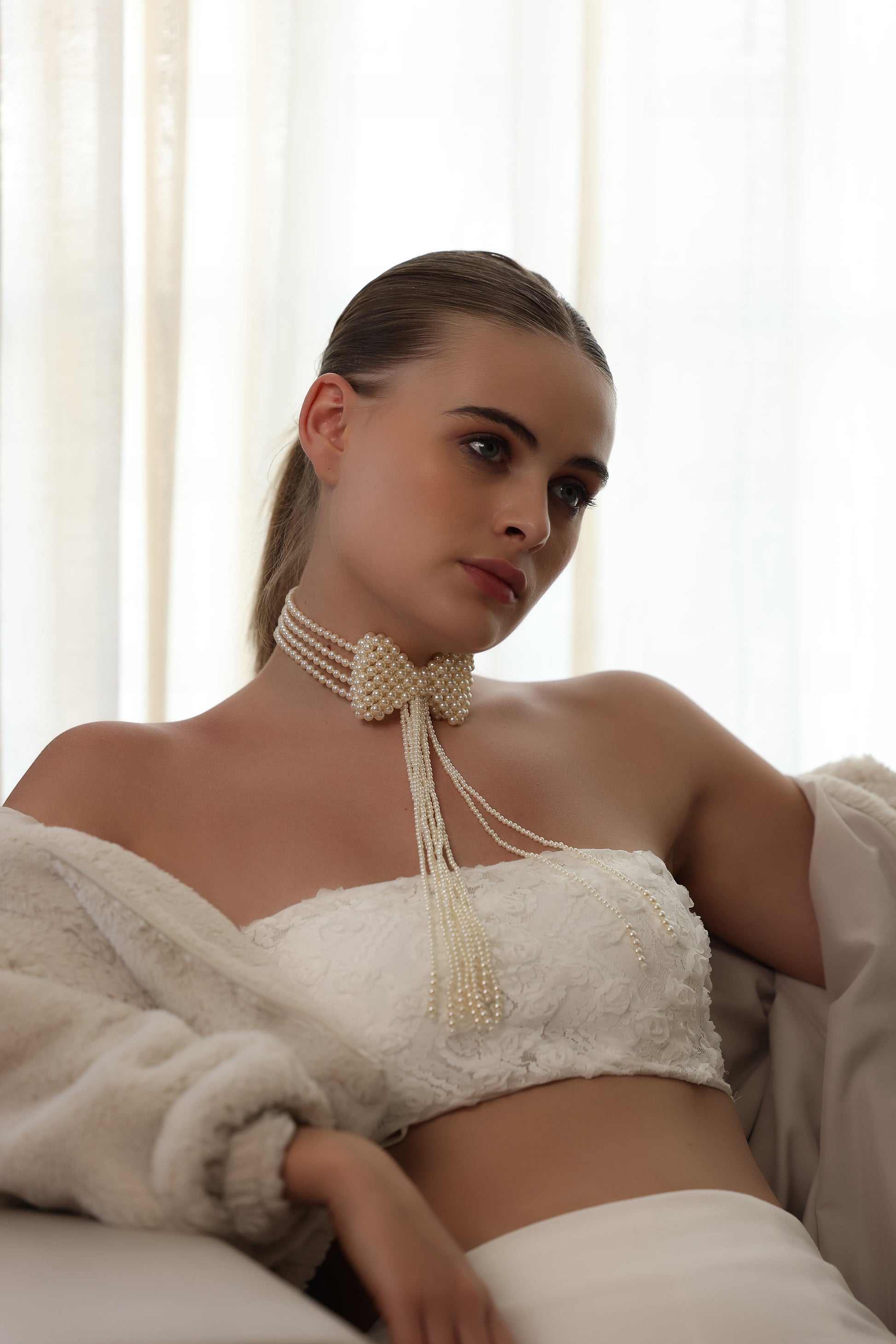 Elevate your style with the Cream Pearl Bow Tie Choker, a statement accessory that blends vintage charm with contemporary sophistication. Featuring meticulously arranged cream pearls in a structured bow tie design, this choker cascades into elegant pearl strands for a luxurious, fashion-forward appeal. Perfect for adding a touch of refinement to evening wear, bridal looks, or editorial styling.