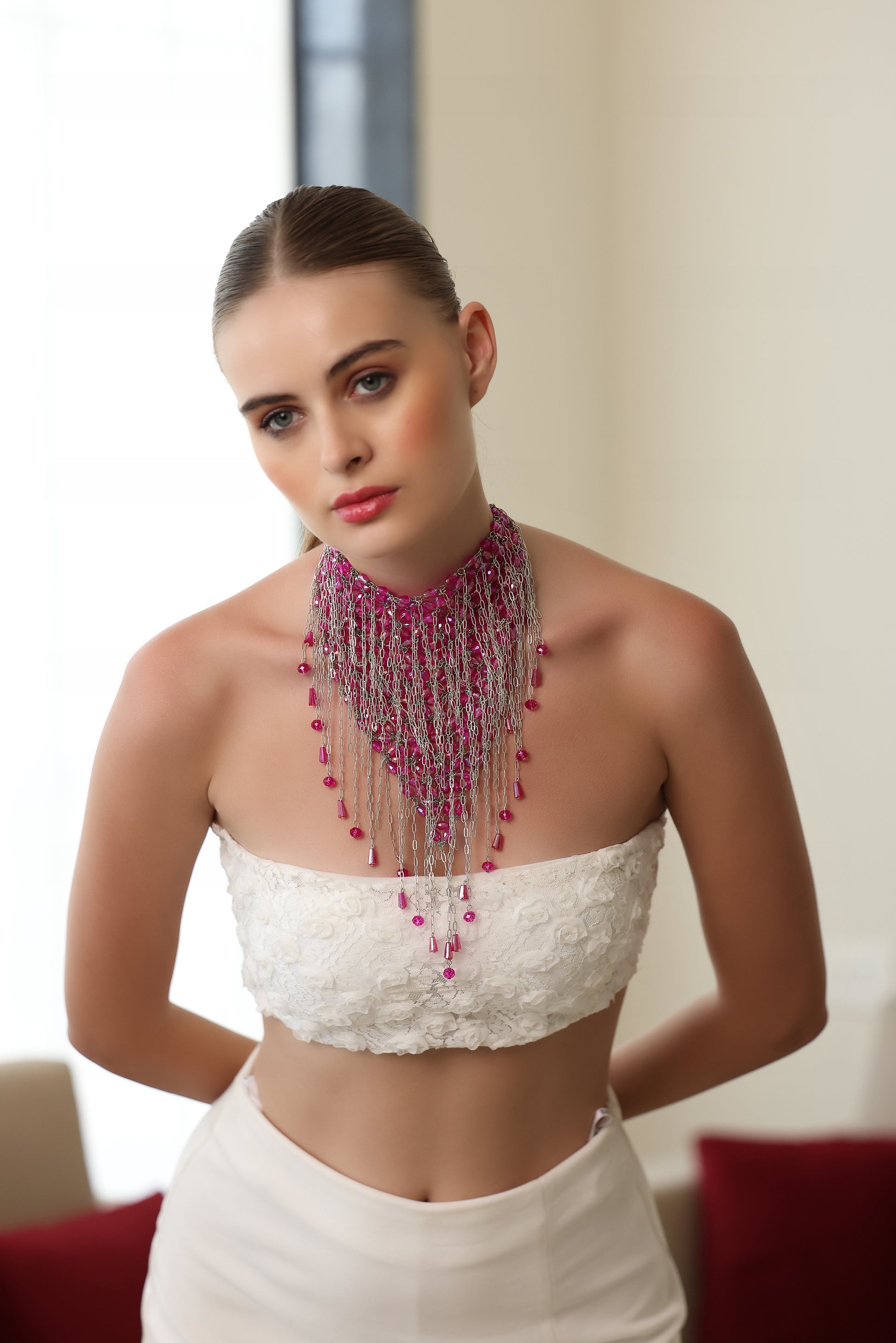 Drape yourself in elegance with our Pink Crystal & Chain Necklace, a stunning fusion of luxury and modern edge. Featuring dazzling pink crystals delicately woven into silver cascading chains, this statement necklace is designed to command attention. Whether paired with evening wear or a chic ensemble, it adds a touch of glamour and sophistication to any look.