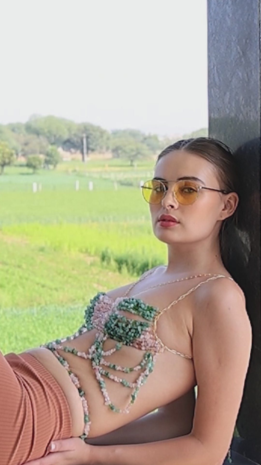 Elevate your festival or beachwear look with this stunning handcrafted gemstone beaded bralette. Designed with delicate green and pink stone accents, golden chain straps, and cascading beadwork, this luxurious piece is perfect for bohemian and high-fashion styling.